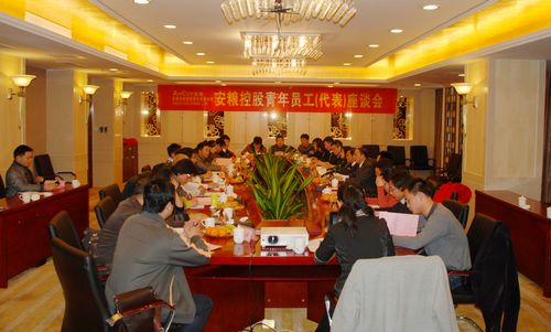 3月28日下午,公司在金滿樓康明國際大酒店組織召開了公司成立以來首次青年員工(代表)座談會。會議由安糧控股辦公室、分工會組織,辦公室、分工會以及團委負責人潘冬生、張來往、武義海、葉冬紅以及五大公司26名青年員工代表參加了座談會。葛志毅副總裁代表公司到會看望與會代表,他表示,公司非常重視青年員工的工作、學習和生活,并將對廣大青年員工提出的合理化建議和意見進行認真研究,予以采納和解答。