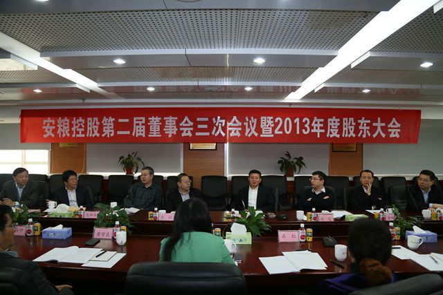 4月13日,公司召開安糧控股第二屆董事會第三次會議暨2013年度股東大會。公司董事會成員包祥華、桂冠、李錦鐸、方宗友、曹訓立、宋恩君參加會議。監事會成員陳素萍、黃學良、石紅及經營層成員儲潔印、潘冬生、張來往列席會議。國貿集團范陽董事長應邀出席會議。會議由董事長主持。