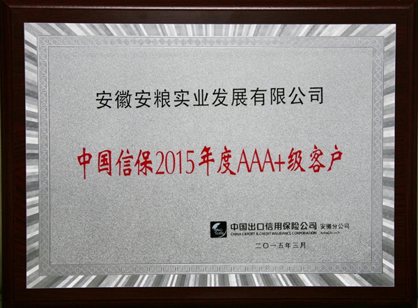 安糧實業成為中國出口信用保險公司在安徽地區近900家企業客戶中第六家獲此殊榮的企業?!爸袊隹谛庞帽kU公司2015年度AAA+級客戶”是中國出口信用保險總公司授予企業客戶的最高級別評價,對于獲得AAA+級評價的單位,中信保公司將特別開通綠色通道,給予限額上浮、優先賠付、審核程序簡化、承保業務范圍擴大等系列鼓勵政策。