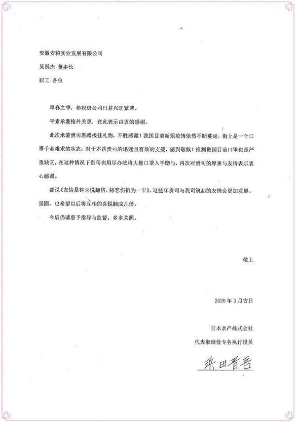 近日,日本水產株式會社的感謝信從東京寄到安糧實業,用以表達對安糧實業捐助其10000只口罩的衷心感謝。
