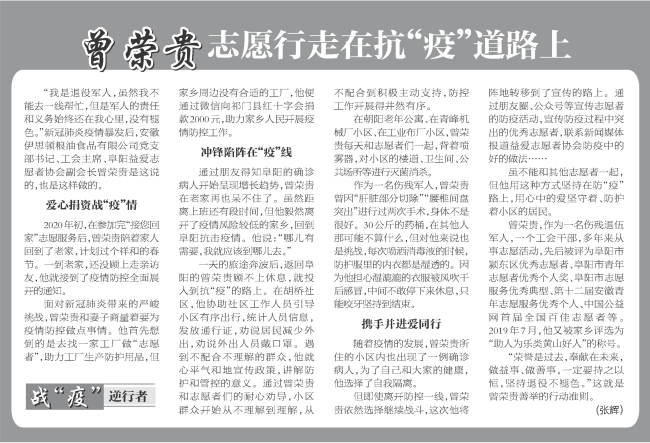 黃山人曾榮貴是安徽伊思頓糧油食品有限公司黨支部書記,他是一名傷殘退伍軍人,擔任阜陽益愛志愿者協會副會長,曾積極參與過大小百余次公益活動,被評選為“助人為樂黃山好人”稱號。在今年新冠病毒蔓延的特殊時期,曾榮貴不僅捐資戰“疫”,更沖鋒在前。正月初一,他就協同當地村兩委積極投入到防控疫情一線,白天走進村委會和公共場所開展防疫消毒,幫助村兩委工作人員開展出入人員管控;晚上編輯公眾號文章,宣傳防疫活動和防疫過程中的好做法,用行動踐行了共產黨員的初心使命,發揮了黨員的先鋒模范作用。