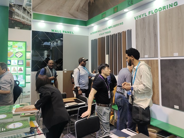 建材展位重點推出了墻板,格柵,樓梯踏板以及木塑戶外地板等新產品,從室內到戶外產品一應俱全。參展部門根據對去年秋季交易會的考察分析以及近期客戶最新詢盤情況的整合梳理,積極開拓更新參展產品。結合國外最新流行的趨勢,推出了拼花木紋,石紋等當下十分暢銷的花色。利用立體燈箱,將產品優勢,產品結構剖面等信息直觀展示,讓客戶更加清晰地了解產品的性能和優點,吸引諸多專業買家的觀看和洽談。此外,在攤位新增產品拼裝的體驗區,增加產品小樣及配件的DIY拼裝,吸引客戶自己動手,大大提升了參與度和體驗感,讓客戶真切地感受到安糧的誠意與新意。
